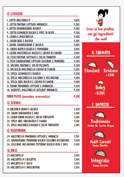 Puoi creare la tua piadina o sceglierla fra le sfiziose, vegetariane e le buonissime dolci.