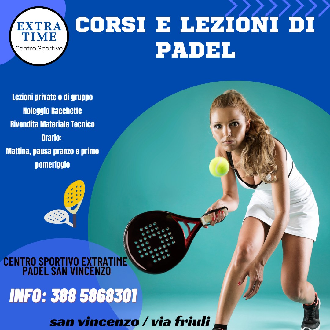 Venite a provare il nuovissimo Centro Sportivo ExtraTime. Campo di calcetto, 2 campi di padel al chiuso, lezioni di fitness con personal trainer, preparazione atletica e riatletizzazione. Lezioni private di padel private o in gruppo, rivendita materiale tecnico, noleggio racchette.