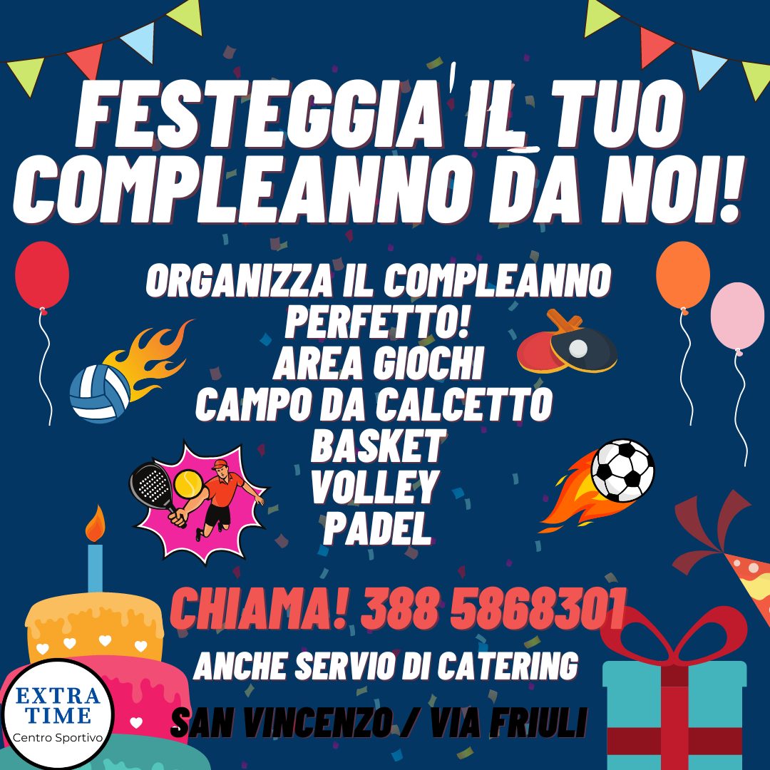 Si organizzano campi solari nei mesi estivi e possibilità di festeggiare il compleanno da noi. Il Centro Sportivo Extratime infatti mette a disposizione un'intera area ristoro e giochi, Puoi usufruire anche del campo da Calcetto, Padel, Volley e Basket! Eseguiamo a richiesta anche un servizio di Catering.